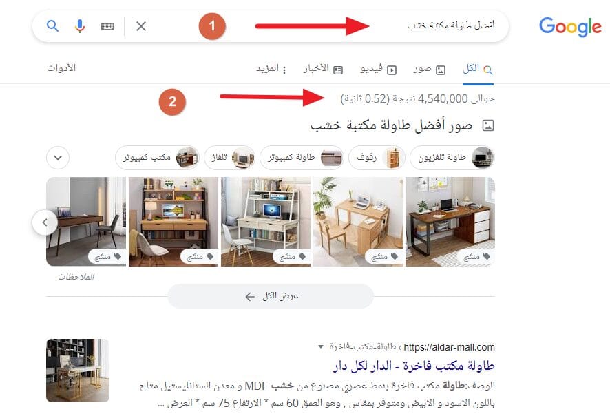 - الكلمات المفتاحية الطويلة: تتكون من أكثر من 3 كلمات ودائمًا ما تكون عبارة طويلة أو جملة، فبدلًا من كلمة “طاولة” تكون هنا “أفضل طاولة مكتبة خشب”. ودائمًا ما تكون قليلة المنافسة وفي نفس الوقت ليس لديها حجم بحث كبير. فعند النظر إلى حجم النتائج المتاحة في محرك البحث ستجدها أقل من الكلمة المفتاحية القصيرة.